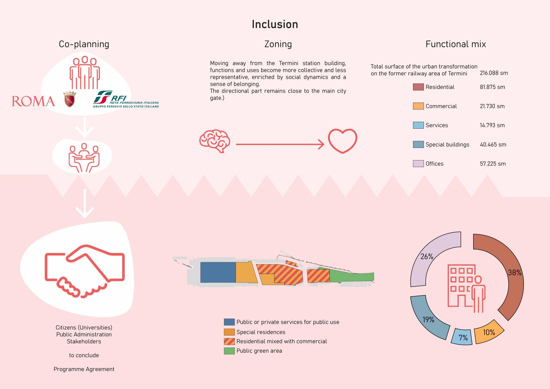The reorganisation of the infrastructural system, the underground high-speed railway link and the new urbanisation of the Termini railway site are possible through a Programme Agreement between the Public Authorities and Rete Ferroviaria Italiana (the infrastructure operator) which provides for a " do ut des " negotiation. Also in the context of the new district, the distinction between public and private areas has been determined by the calculation of the percentages of services and green areas needed by the whole surrounding area and the profit margins that RFI could obtain.