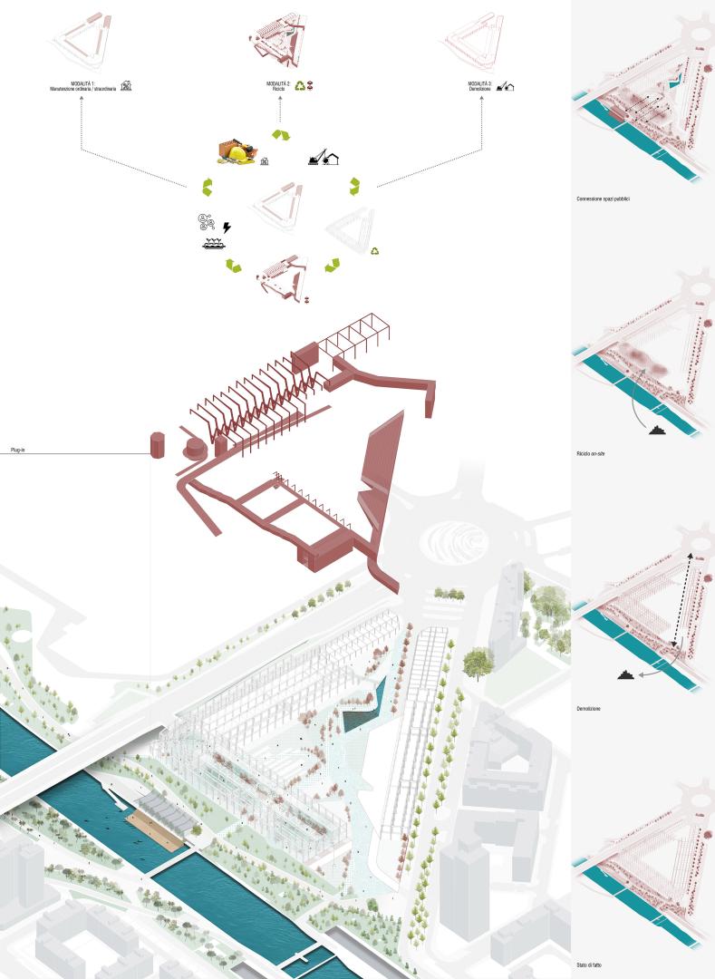 Recycling makes it possible to see existing architecture as a resource to be able to create a "new" architecture that «has a multiple, multifaceted functionality, and therefore a certain versatility of spaces, as only [...] versatility makes this possible that characterizes the city, namely the overlapping of uses. the recycling operation translates into its urban dimension through the recycling of public space, and into its architectural dimension through the recycling of the market, reaching a final hybrid image that will be the synthesis of the complex dynamics that characterize the physical and theoretical context in which the project is inserted into.