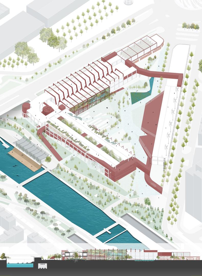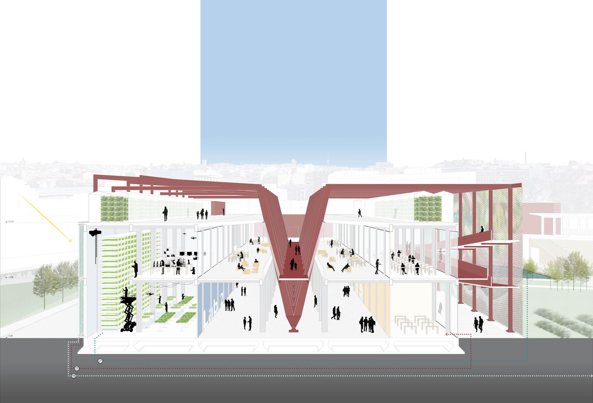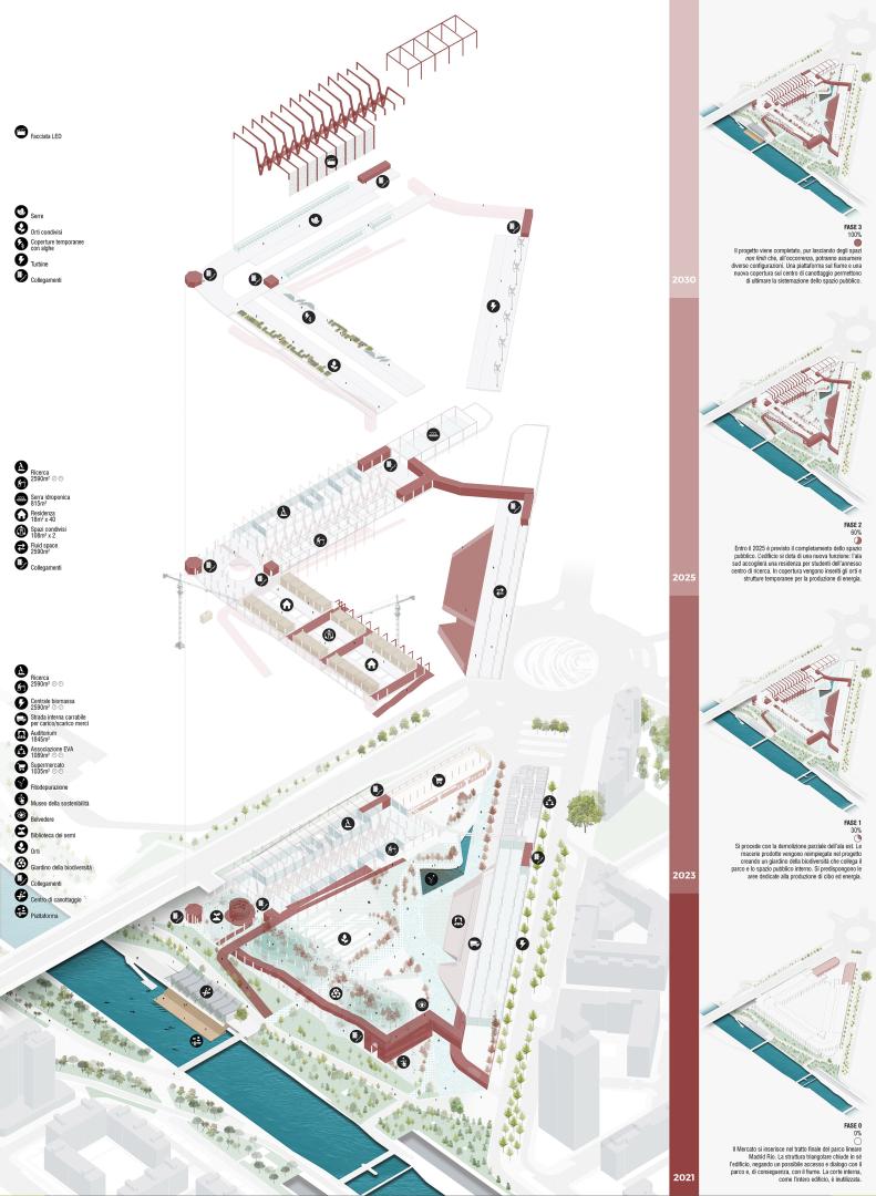 The project aims to recycle Madrid's Mercado de Frutas e Verduras, a building disused in 1983 located south of the city in a strategic position between the two linear parks that line the Manzanarre: the Madrid Río and the Parque Lineal del Manzanares. The recycling of the building will contribute to the creation of a self-sufficient and sustainable city: it will be a productive and highly technological building, in which different types of agriculture will be used for the production of food and the waste will find a second life in energy production, thus creating a closed circle in which everything is transformed.