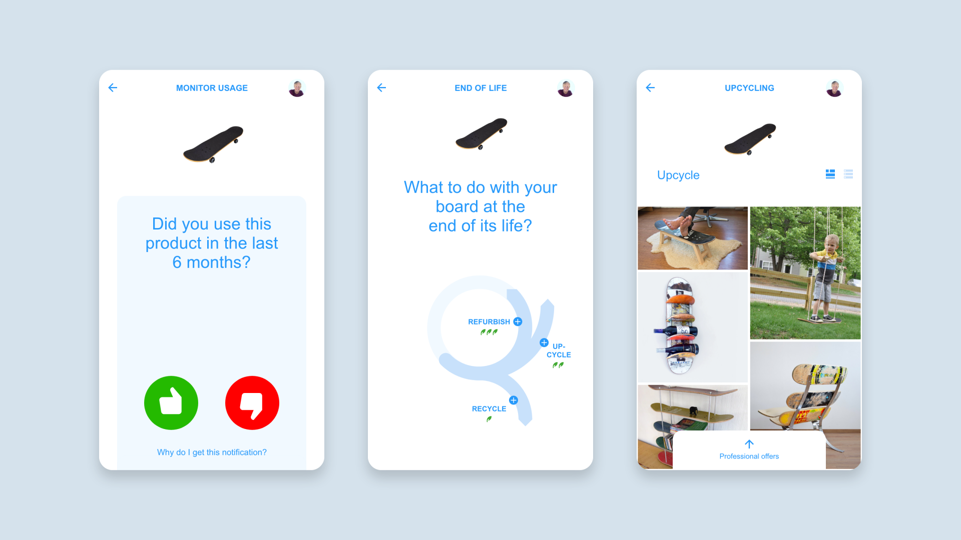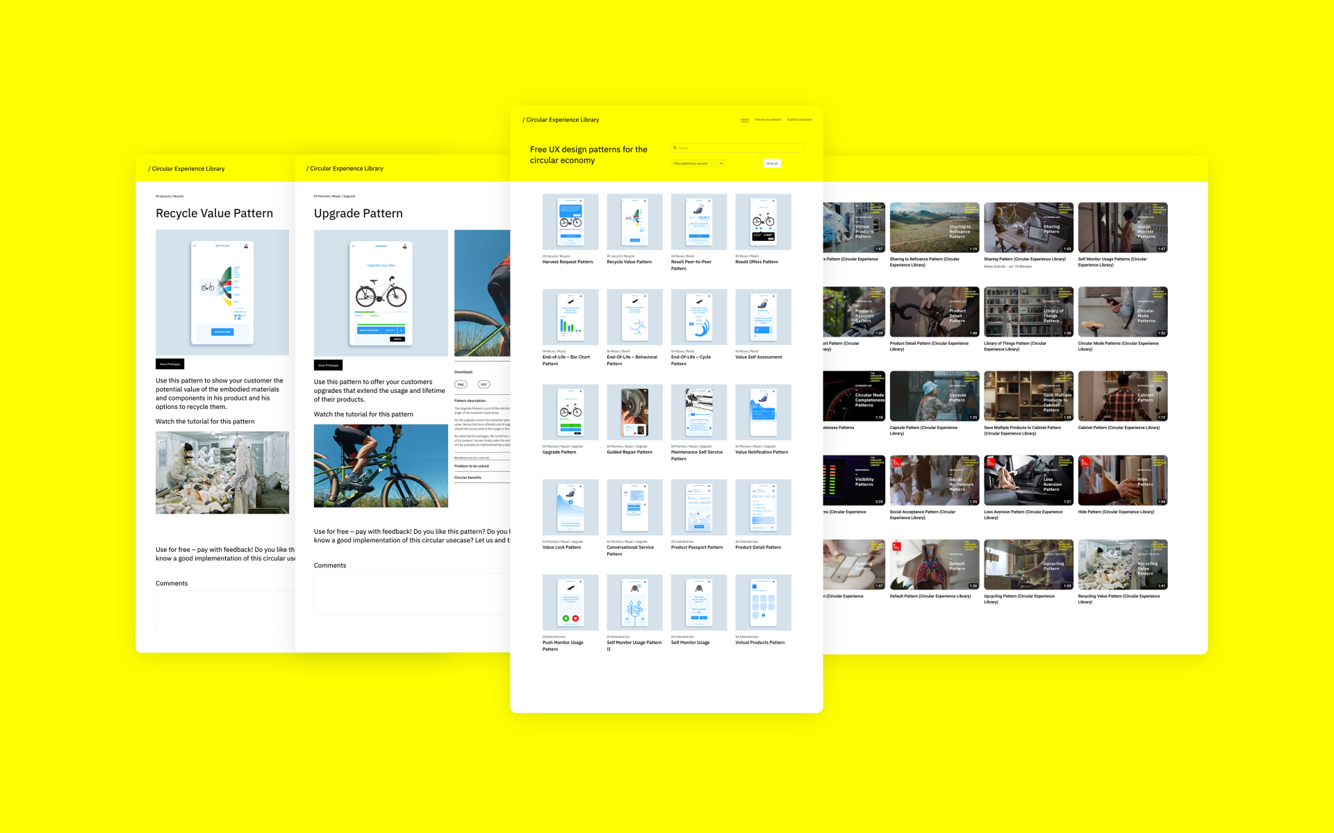 The Circular Experience Library is a free library of UX design patterns. They focus on making the user experience of customers / citizens in the circular economy more joyful and effortless. The patterns address the main activities of customers in the circular economy (rethink, refuse, extended use, refurbish, repair, reuse, upcycle and recycle). They cover specific use cases from the point of view of endusers: "Decide for a used, shared of product-as-a-service model instead of buying a new product", "Refurbish it to extend its lifetime", "Refinance your product by sharing it with others". In addition, the library contains basic patterns that cover specific needs in the circular economy like the display of materials contained in a product or receiving alerts in different channels to do maintenance on a product. There’s also a prototype based on the digital product passport as planned by the EU. The patterns consist of wireframes optimized for mobile applications and come with a tutorial video, a clickable prototype, a pattern description and digital downloads in several formats. The patterns are focussed on the use in digital applications that enable circular services like product-as-a-service, sharing or tutorials for repair, but can also be used for ideation of analogue services.