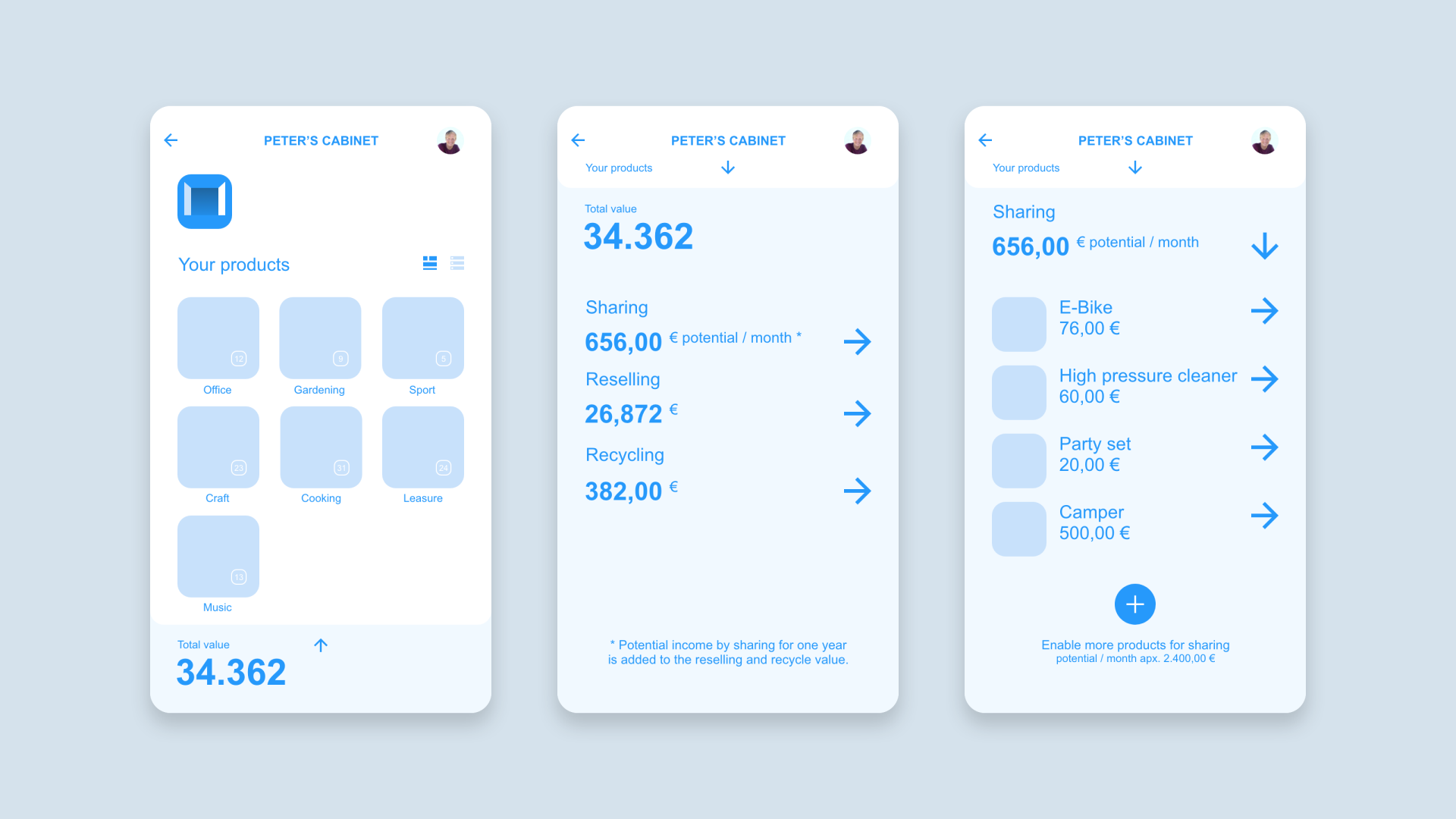 The Circular Experience Library was developed in an agile process within 10 months. First, we defined the use cases, then the 72 patterns to cover them. After that, we developed the wireframes and did iterations of them over and over again, adding micro interactions, building complete clickable prototypes and defining common elements of the patterns like the display of product value or the display of embodied materials of a product.