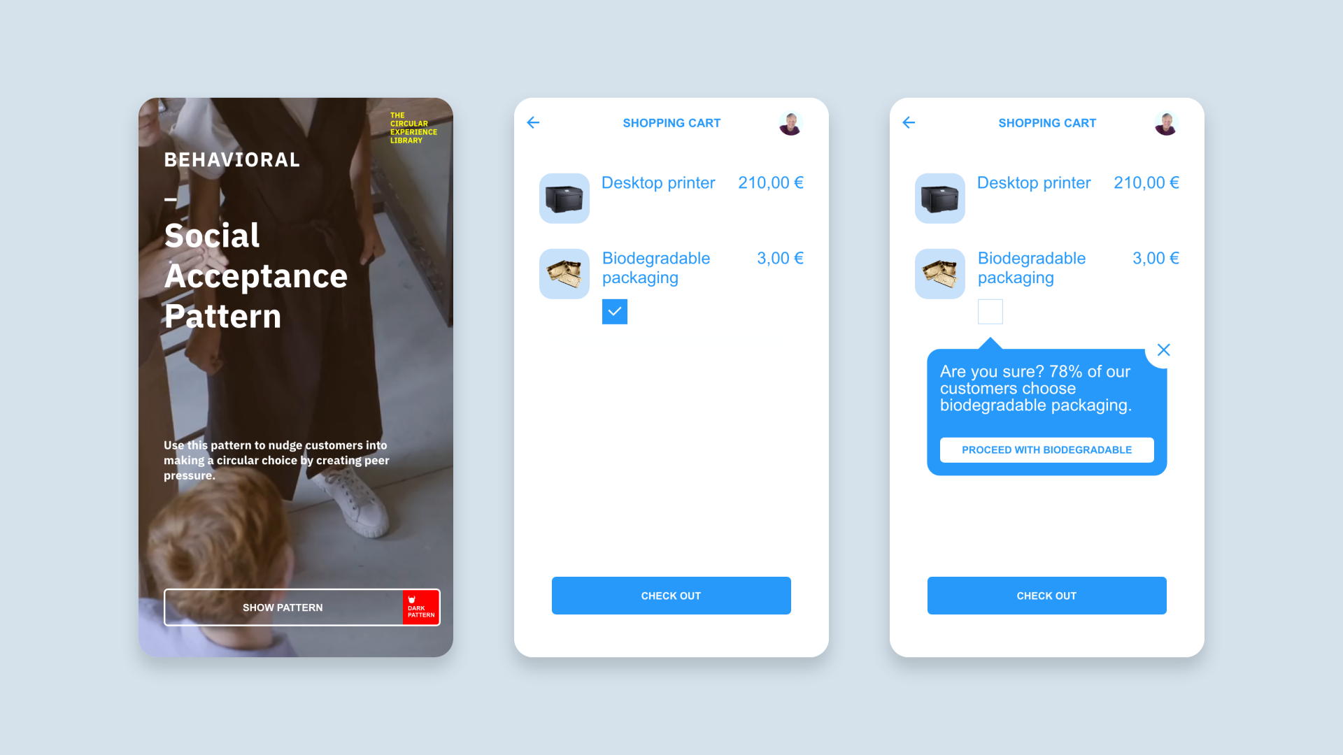 The key objective of the library in terms of aesthetics and quality of experience of people is to make the (new) task of customers in the circular economy joyful and effortless. The initiative is exemplary in this context, because all design toolkits for the circular economy focus on the design of products, materials and production processes. Which is good, because this is where the heavy lifting needs to be done. But by focussing on the experience of people, the library will support designers and companies to make sure that consumers actually use circular products in a circular way. The design patterns are deliberately designed in a visually neutral and basic look, as it is up to the designers who apply them to add the aesthetics of the brand and product they work for.