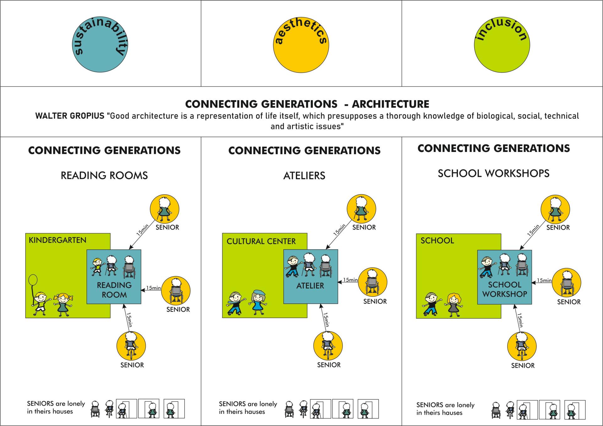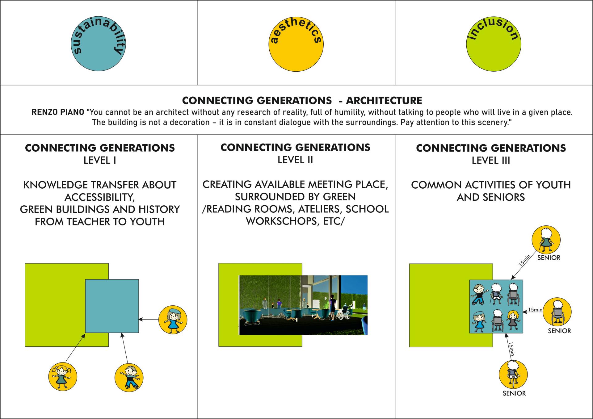 *Creating places for intergenerational spending time among greenery, surrounded by accessible architecture, close to home (about 15- 20 minutes from the place of residence), giving a new role to buildings in cities.