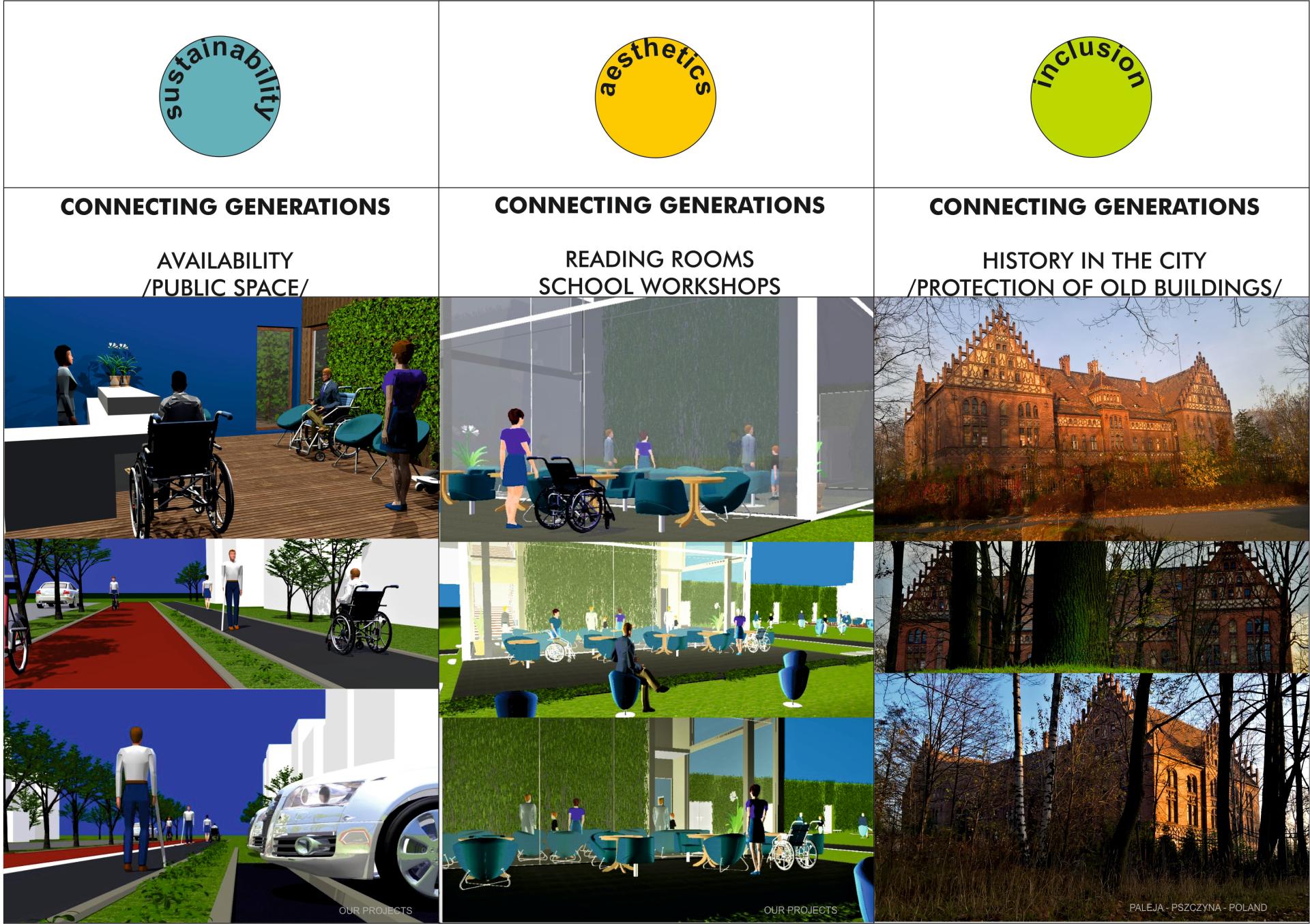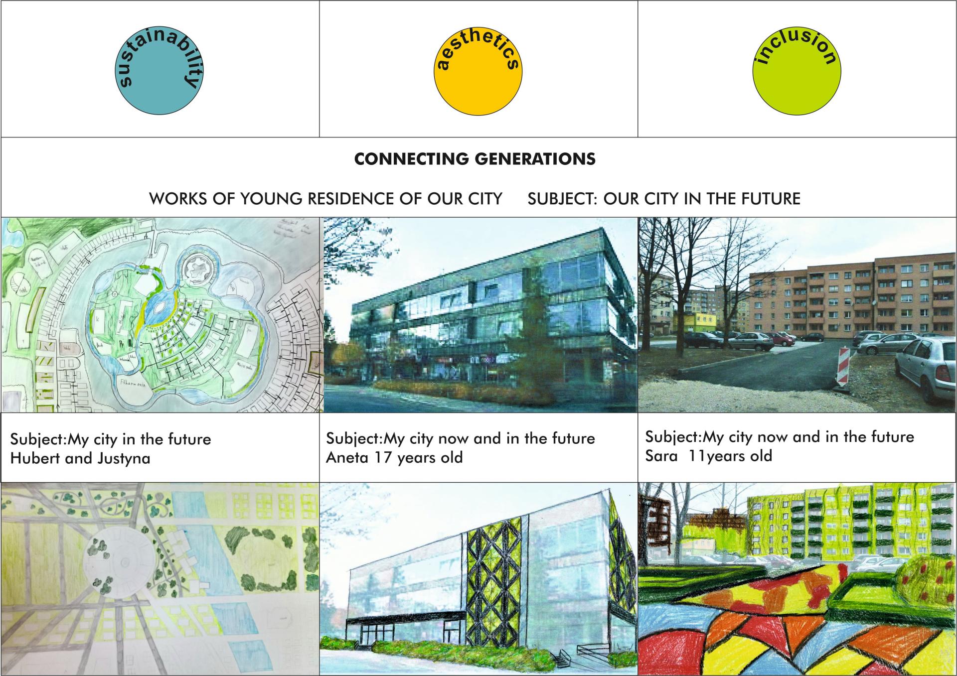 CONNECTING GENERATIONS - the current education of young people in the field of architecture and urban planning brings measurable results in the form of high awards in architectural competitions (2nd and 3rd place in a national competition organized by the chamber of architects "Kształtowanie Przestrzeni"). Young people recognized spaces in which there is no accessibility for people with disabilities, they notice historical buildings that need renovation, they point out the lack of green spaces in the city and bicycle paths (the exercise charts are attached).