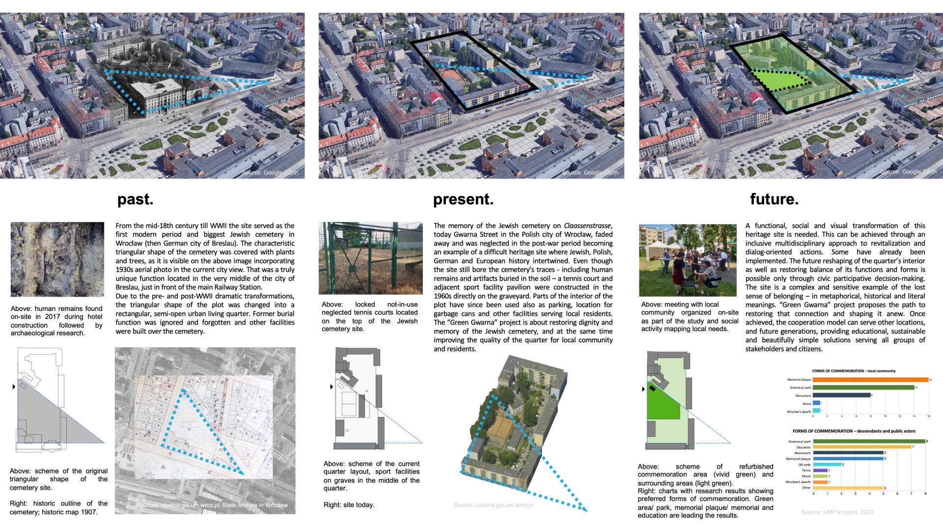 “Green Gwarna” proposes a comprehensive series of well-planned activities leading to functional, social and visual transformation of a heritage site in Wrocław (European Capital of Culture 2016). The memory of the Jewish cemetery on Gwarna Street in currently Polish Wrocław (former Claassenstrasse in the German city of Breslau), faded away and was neglected in the post-war period after 1945, becoming an example of a difficult heritage site where Jewish, Polish, German and European history intertwined. Currently, the area of the cemetery, located in the very city center, is an abandoned, unaesthetic and disarrayed plot of land, constituting both physical and symbolic scar on the city’s tissue - typical for many European (in particular Central and Eastern European) cities that experienced the whirlwinds of the 20th century. As Judaism does now allow the human remains to be exhumed, the project aims at restoring dignity and memory of the Jewish cemetery and improving the quality of the quarter for residents.