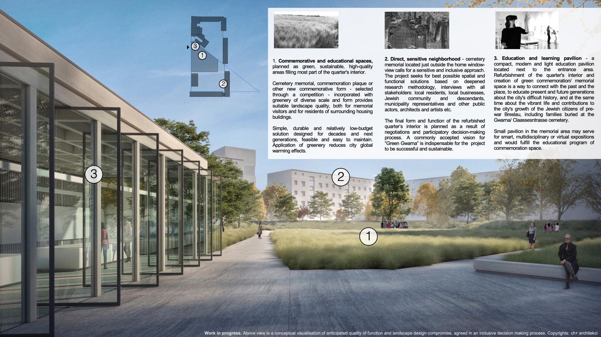 A compact, modern and light education pavilion could be located next to the entrance area. Refurbishment of the quarter's interior and creation of space where local residents, citizens of Wrocław and visitors can spend their free time combined with green commemoration/ memorial space is a way to connect with the past and the place, to educate present and future generations about the city's difficult history, and at the same time about the vibrant life and contributions to the city's growth of the Jewish citizens of pre-war Breslau, including families buried at the Gwarna/ Claassesntrasse cemetery.