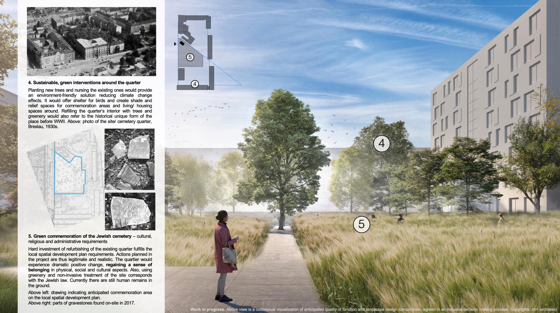Cemetery commemoration in the middle of a housing quarter is not an easy task and the design has to respond to inhabitants’ needs going beyond the historical meaning of the site. In addition, there is also the aspect of double otherness of the site as the cemetery was/is a Jewish-German heritage pointing to the German pre-war past of the today Polish city of Wrocław. It is crucial to reach solutions in the spirit of dialog and understanding of various cultures and stakeholders.