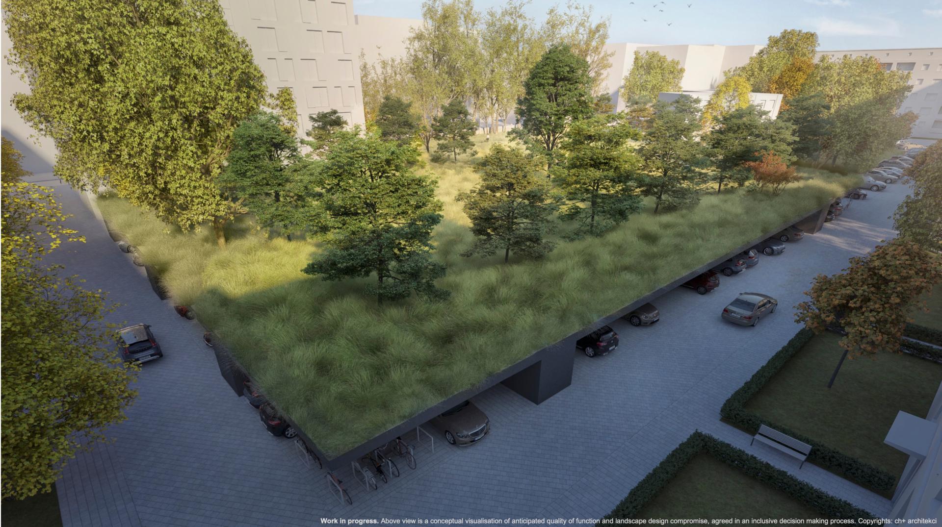 As the quarter’s interior has to support living needs of its residents, such as car and bike parking places and garbage facilities, it is vital to find smart solutions serving both, the service/ technical part of the quarter and as the cemetery commemoration space (sacrum– profanum situation).