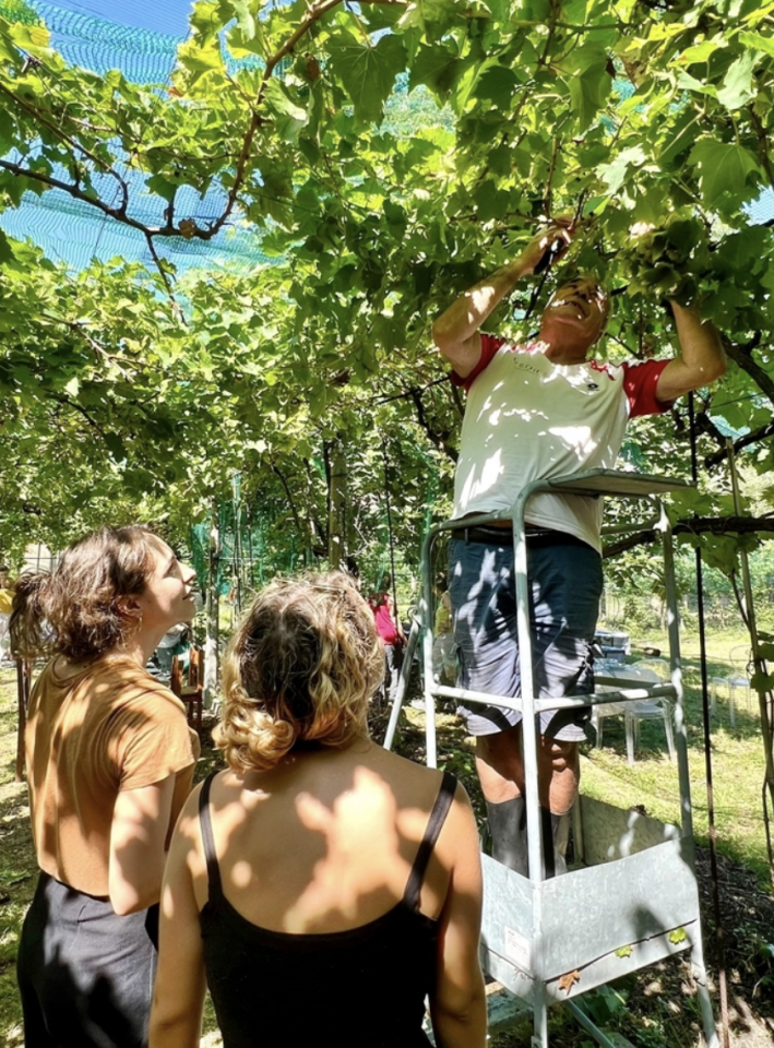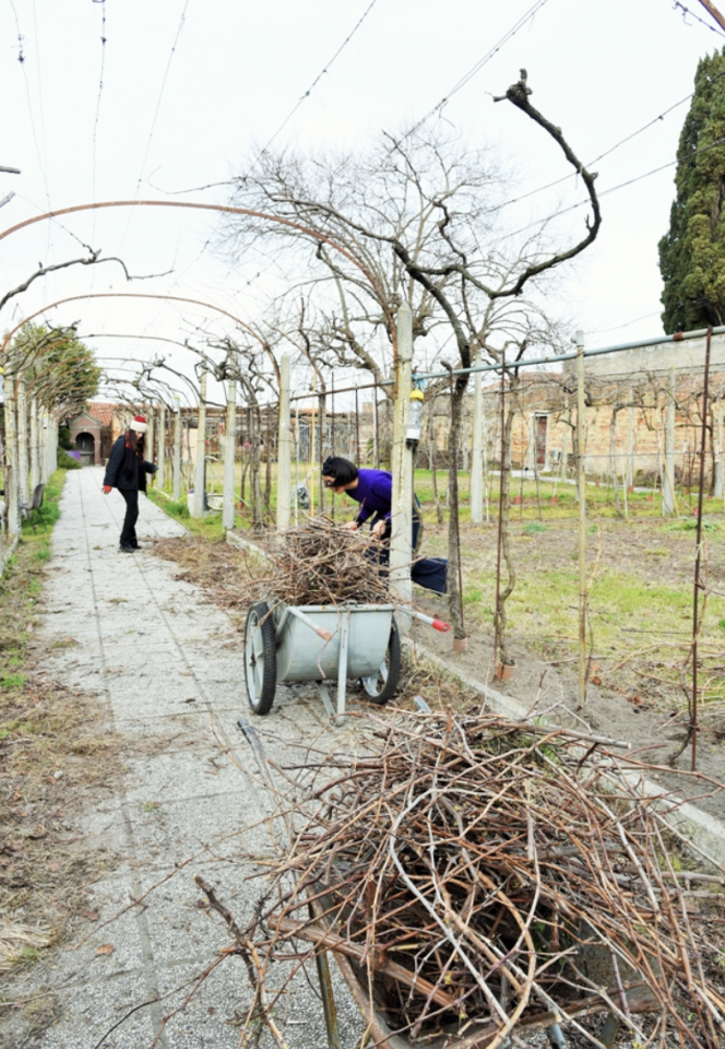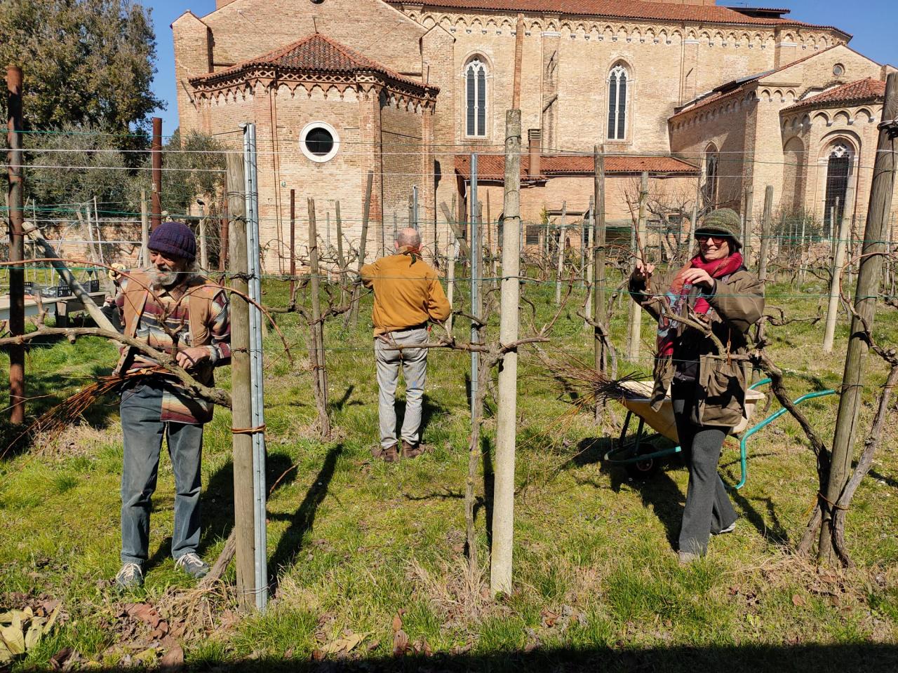 By restoring abandoned vineyards, olive groves, and aromatic gardens, once cultivated by monks in now-abandoned monasteries, Laguna nel Bicchiere revives the deep nature-culture heritage of the Venetian lagoon. It transforms neglected, beautiful, and harmonious spaces into vibrant, living landscapes where history, tradition, and the present merge, offering a deep sensory and emotional experience to those who engage with it. Beauty, in our project, is about creating meaningful encounters between people, places, and history. The vineyards and gardens we restore are more than agricultural sites; they are cultural landscapes, where each vine and olive tree witness an old lifestyle and historical time in a contemporary nexus. Taking care of these cultural landscapes is a multisensory journey—the scent of wild herbs, the texture of the soil, and the changing colors of vines through the seasons—all awaken a connection to nature in the unique heritage of Venice’s hidden greens. Moreover, these spaces offer a chance to experience Venice beyond its postcard image, rediscovering its rural soul and its fragile balance with the lagoon ecosystem and its inhabitants. In this context, Laguna nel Bicchiere acts as a connector, providing opportunities for people to meet, work together, and share knowledge, creating a sense of belonging through collective care for the land. Whether it’s children planting or harvesting guided by elders, university students engaging in research, or our international group of volunteers experiencing Venetian traditions firsthand, these encounters generate deep social and emotional bonds that go beyond generational and cultural divides. The simple act of tending to plants together becomes an act of mutual care—not only for the land but for each other. Beauty is not just preserving the past—it evolves with the present and works toward a future, hopefully, guided by the mutual care values the association brings forward.