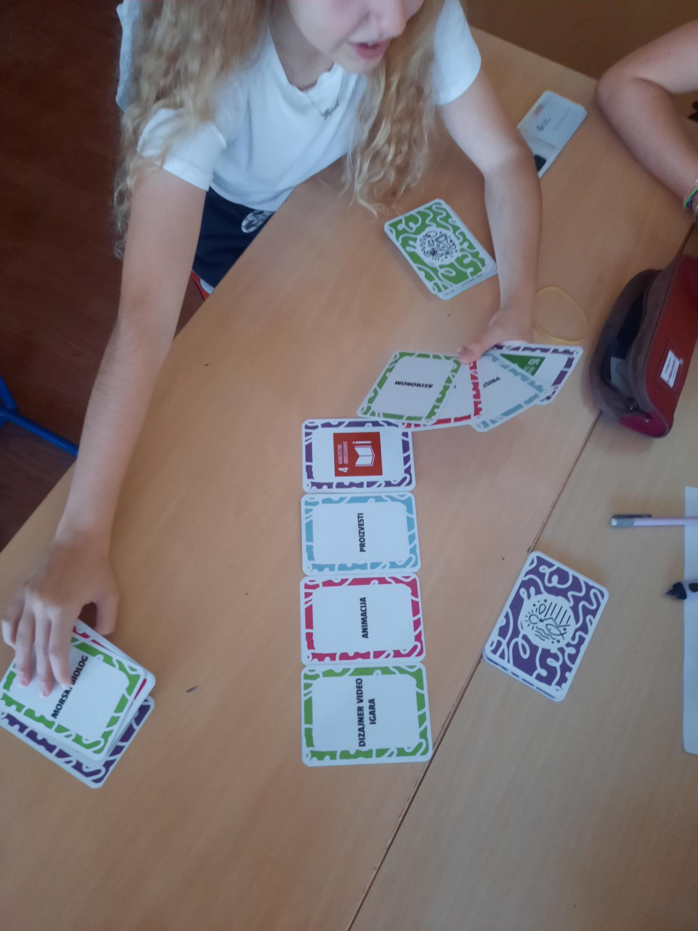The methodology is based on an interactive environment in which young people must use skills from different domains to solve a given problem in an innovative way with the help of a mentor who does not offer traditionally prescribed solutions and is implemented through a card game. There are four categorized decks of cards: Art, UN’s Sustainable Development Goals, Concepts and STEAM occupations and the game can be carried out in one, two or three phases, depending on the available time. Working in teams, participants use the combination of four cards they have randomly picked from the decks (one card from each deck) to form a problem question that integrates concepts from all cards (example of a problem questions: How can a food technician encourage sustainable food through art). Based on the formed question, the workshop can continue in three versions: short (posing the question – brainstorming – presenting the solution to others), medium (posing the question – brainstorming – development of the prototype – presenting the solution) and extended (posing the question – brainstorming – prototype development – iteration – presentation). All of this can play out in face-to-face workshops or online and the participants create a prototype solution with materials available to them in their schools or homes.