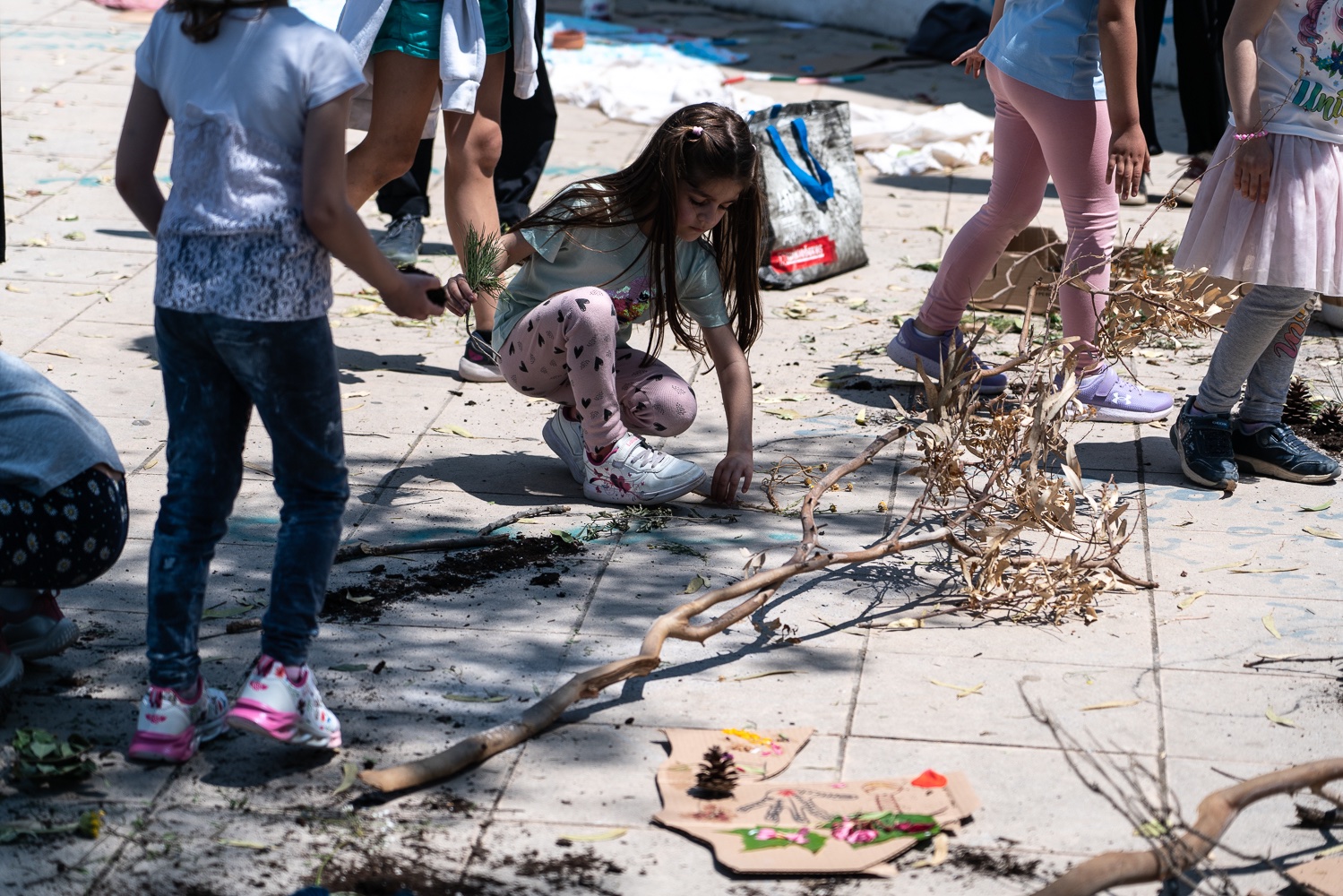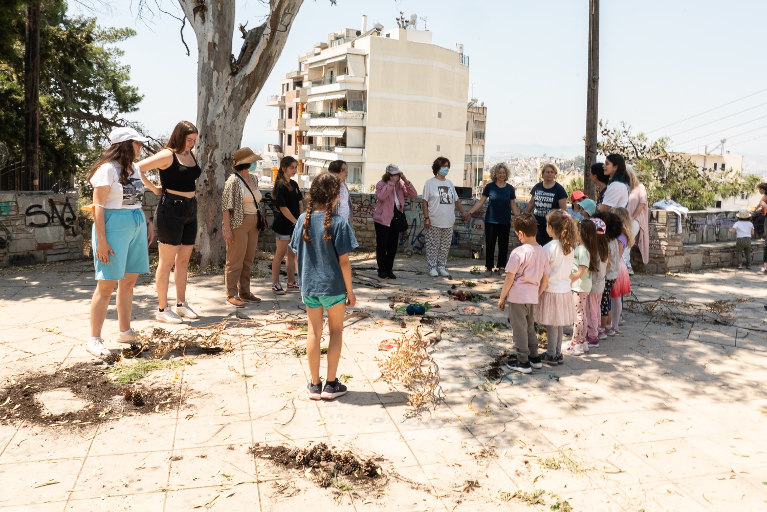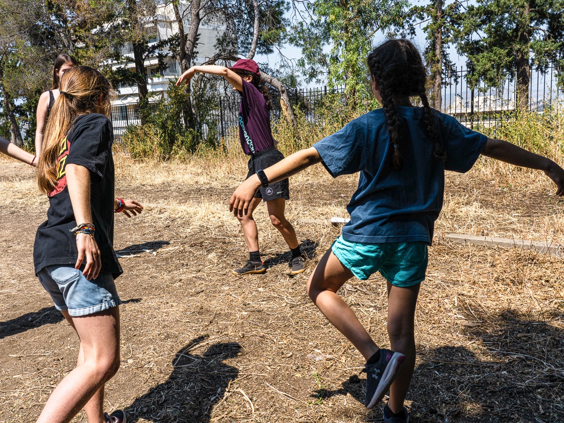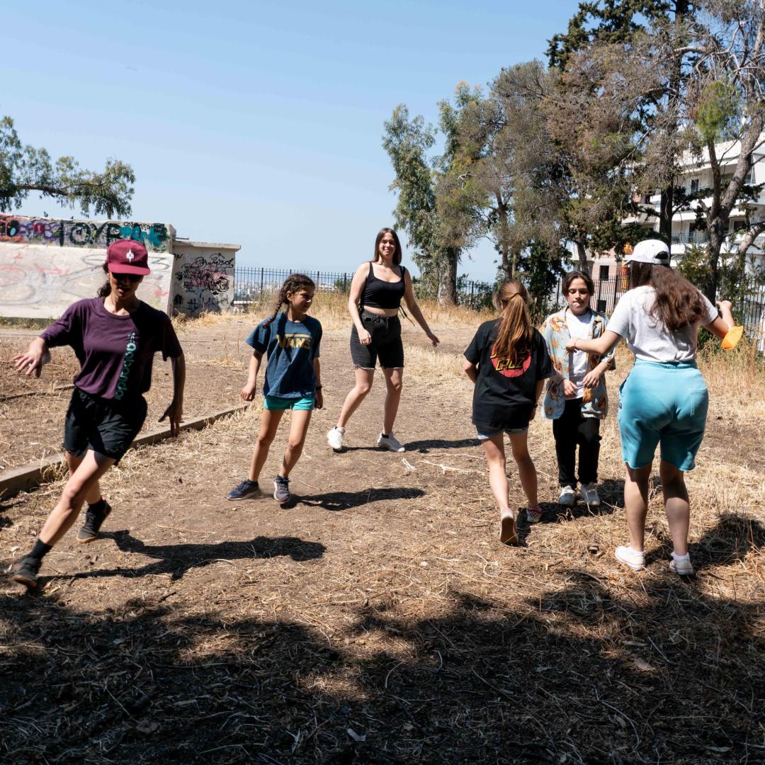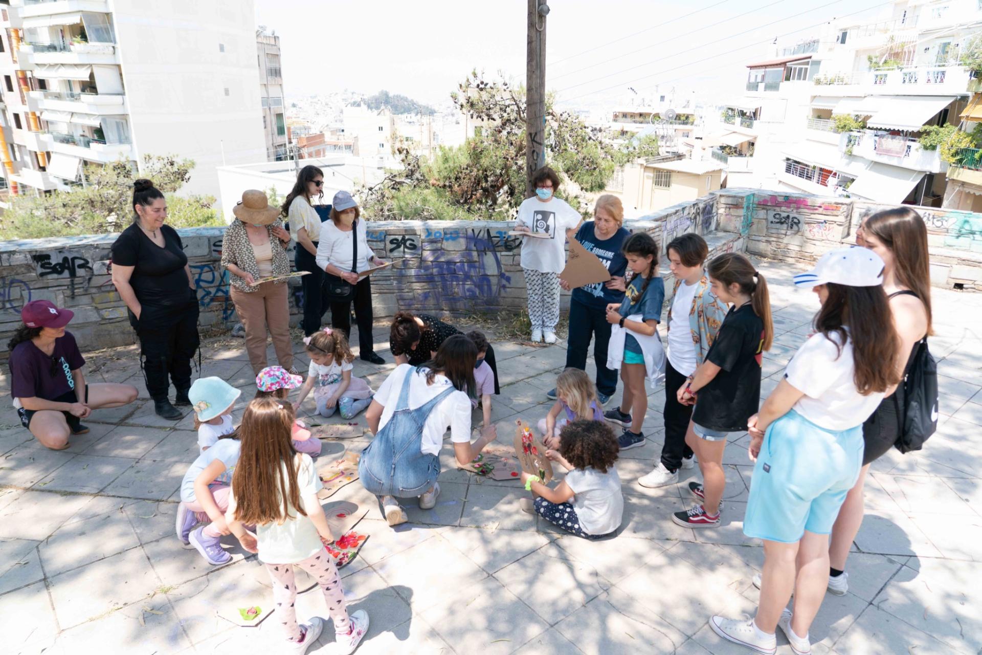 MOVING GROUND created an exemplary framework of inclusiveness by adopting an intergenerational approach, focusing on socially isolated or underrepresented groups in the neighbourhood, such as preschool children, seniors and the unemployed, that interacted with professionals, students, artists and scientists. Artists of a wide age range, experience and artistic practices were invited to think through their needs, interests, and energy in all four pillars of MOVING GROUND in order to generate their proposals for artistic and educational programs. The series of educational programs that was established during the MG project encompass all age groups. Workshops on dance, creative movement, and visual arts address kids (Preschool + Primary school ages 4-8). A series of environmental and educational actions addressed and actively involved high school adolescents (ages 12-17) from the public schools of the municipality of Vyronas and were based on fundamental principles of experiential methods, and active participation in the learning process. In addition, a gentle dance practice enhancing ease and creativity addressed retired people and third age groups (ages 65+). All events were accessible and free of cost to participants.
