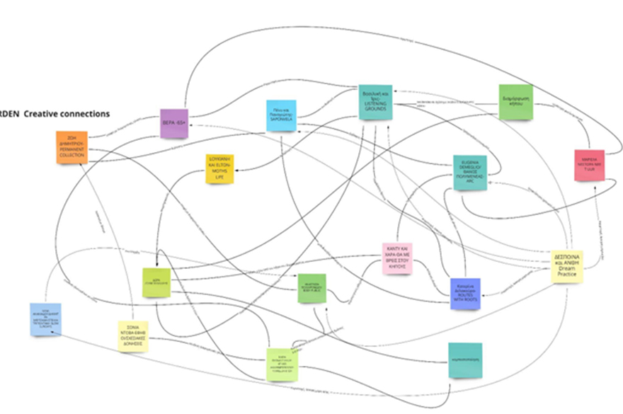 Curating and design have been undertaken by an interdisciplinary team consisting of two choreographers, a visual artist, two architects, a film director, two botanists and the artistic director of the DDRC. MG involved dancers and choreographers, students, architects, researchers, artists, botanists, permaculture educators, scientists, and teachers, as well as citizens of all ages as well as the community of the Municipality of Vyronas. The representatives of the different fields interacted in a non-hierarchical manner, blurring the limits between their practices and allowing to radically rethink them, by interacting with other disciplines, methodologies, and approaches. Permaculture principles such as designing from patterns to details, or the concept of edge dynamics affected the form of the choreographies developed, while the capacity of spatial practices to transcend time, and envision alternate futures, altered their structure. Scientific understanding of botany such as indigenous species, resilience, adaptability and versatility were paralleled to artists themselves and their trajectory. The rigidity that spatial practices often demonstrate when approaching space was softened by versatile dance practices, influenced by the underlying and interconnected structures of nature. “Response art” provided an alternative way of witnessing and responding to art projects, creating a field of interaction and a positive feedback loop between artists engaged in different fields reflecting and commenting on each other’s work. This was perceived as a way of developing net-positive approaches for artistic practices. Designing and maintaining a garden created a methodology and toolkit for life in general, where understanding the interrelations of the human and non-human worlds was prevalent. The connections established between the corporeal aspects of dance practices with permaculture contributed in novel ways to the debate about regenerative practices and the world of dance.