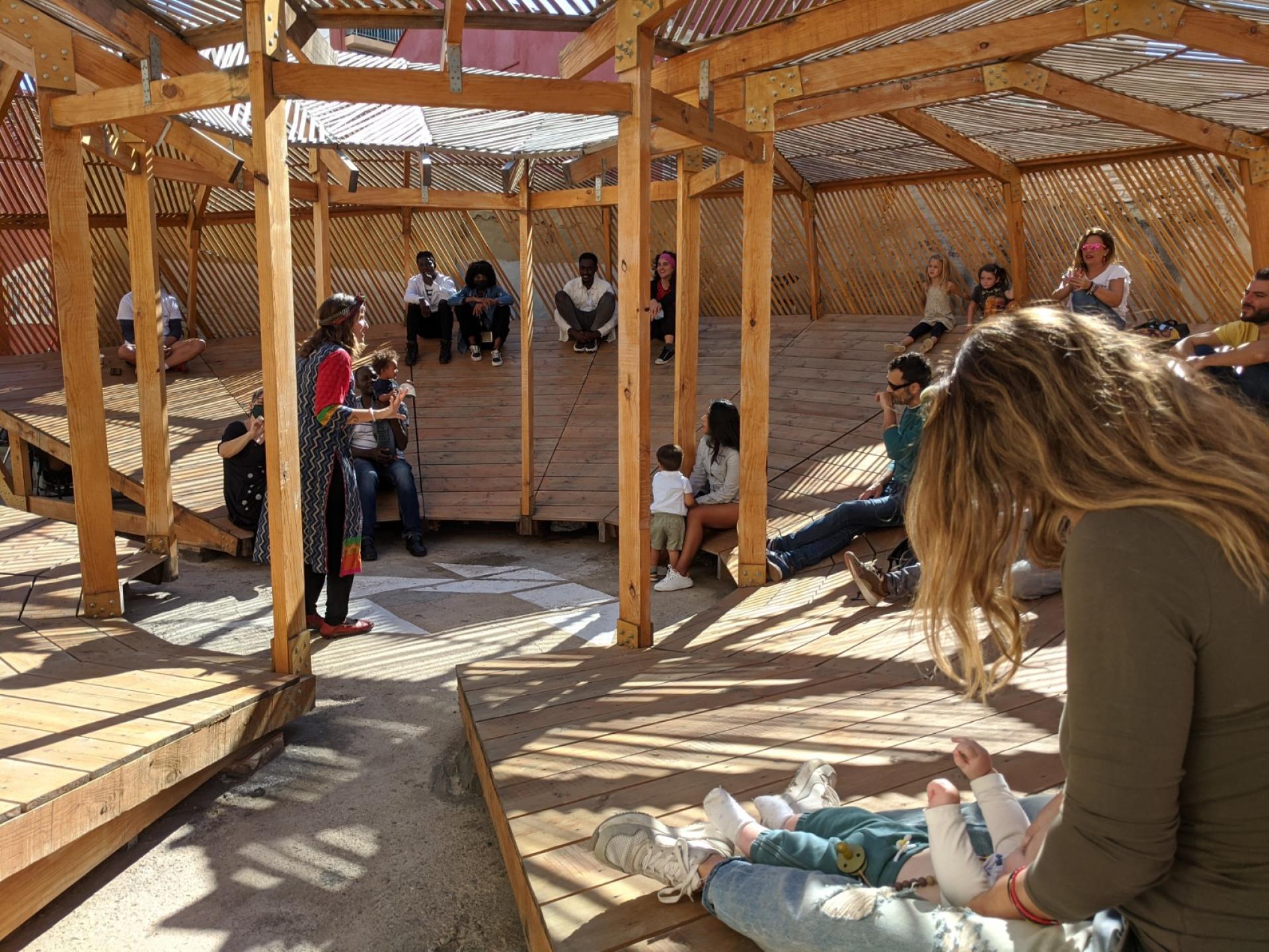 - The large circular wooden structure is a space that attracts the attention of everyone who passes by. It generates a feeling of comfort and seclusion from the inside and does not represent a visual limit from the outside. In addition, it can be decorated and adapted to the events held in the space.